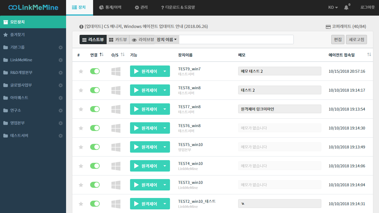 1. 에이전트가 로그인 된 원격 장치는 연결 표시가 활성화됩니다. 제어하고자 하는 대상 장치에 [원격제어] 버튼을 클릭합니다.