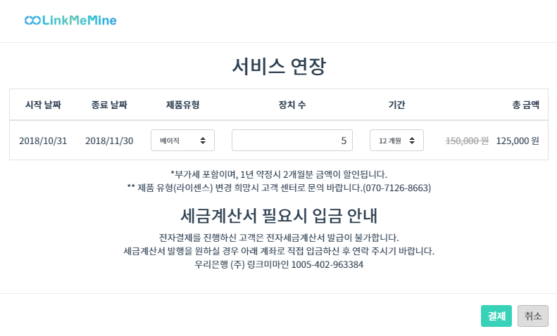 3. [제품유형], [장치 수], [기간]을 설정 후 총 금액이 변경된 것을 확인하고 [결제]를 클릭합니다. 세금계산서 발행이 필요한 법인 고객의 경우, 무통장입금 후 고객센터(02-6949-0488)로 연락 주시기 바랍니다.