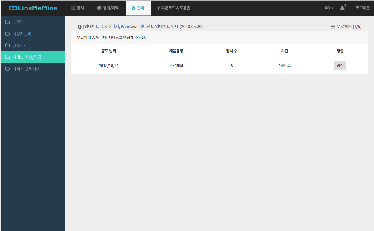 1. 웹 매니저 로그인 후 [관리] > [서비스 신청/연장]을 클릭합니다.