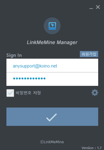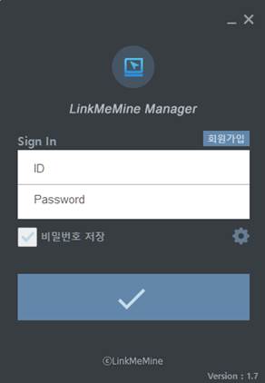 2) 설정: CS 매니저 프로그램에 대한 환경 설정을 실행합니다. 바탕화면에 [LinkMeMine Manager] 아이콘이 생성되며 가입하신 계정 정보로 로그인하여 매니저 프로그램을 실행합니다.