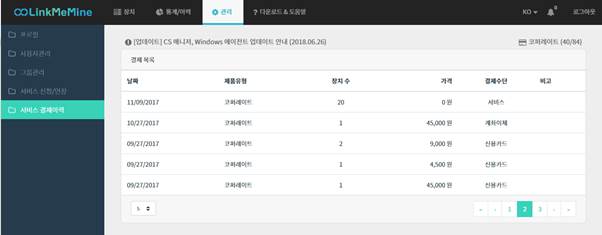2. 상단 [관리] > 좌측 [서비스 결제이력]에서 확인 가능합니다.